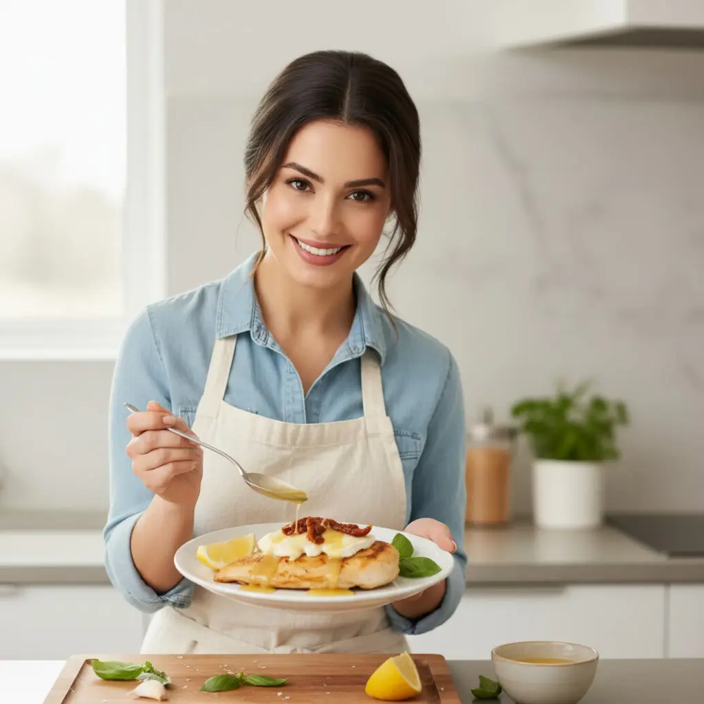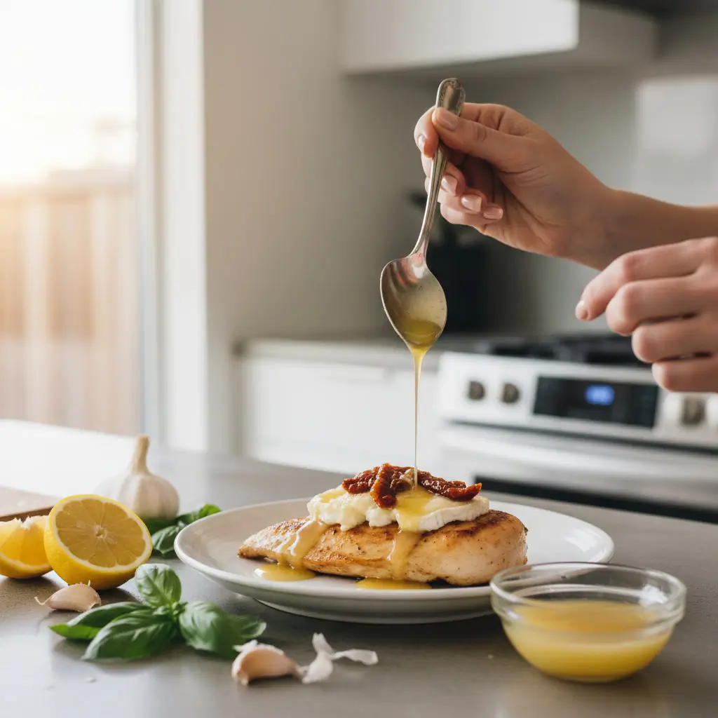 Recipe Instructions: Step 1 Place chicken breasts between plastic wrap and pound to an even 1/4-inch thickness. Step 2 Prepare a marinade with olive oil, lemon juice, garlic, salt, pepper and herbs. Marinate chicken for at least 30 minutes. Step 3 Heat a skillet with olive oil over medium-high heat. Step 4 Cook chicken for 5–6 minutes per side until golden and the internal temperature reaches 165°F (74°C). Step 5 In a small pan, melt butter and whisk in fresh lemon juice and garlic to create a smooth lemon butter sauce. Step 6 Crumble goat cheese and mix with chopped sun-dried tomatoes and fresh basil. Step 7 Place the goat cheese mixture on top of the cooked chicken. Step 8 Broil for 1–2 minutes until the cheese melts slightly. Step 9 Spoon the lemon butter sauce over the chicken. Step 10 Serve immediately, optionally with pasta coated in extra lemon butter sauce.