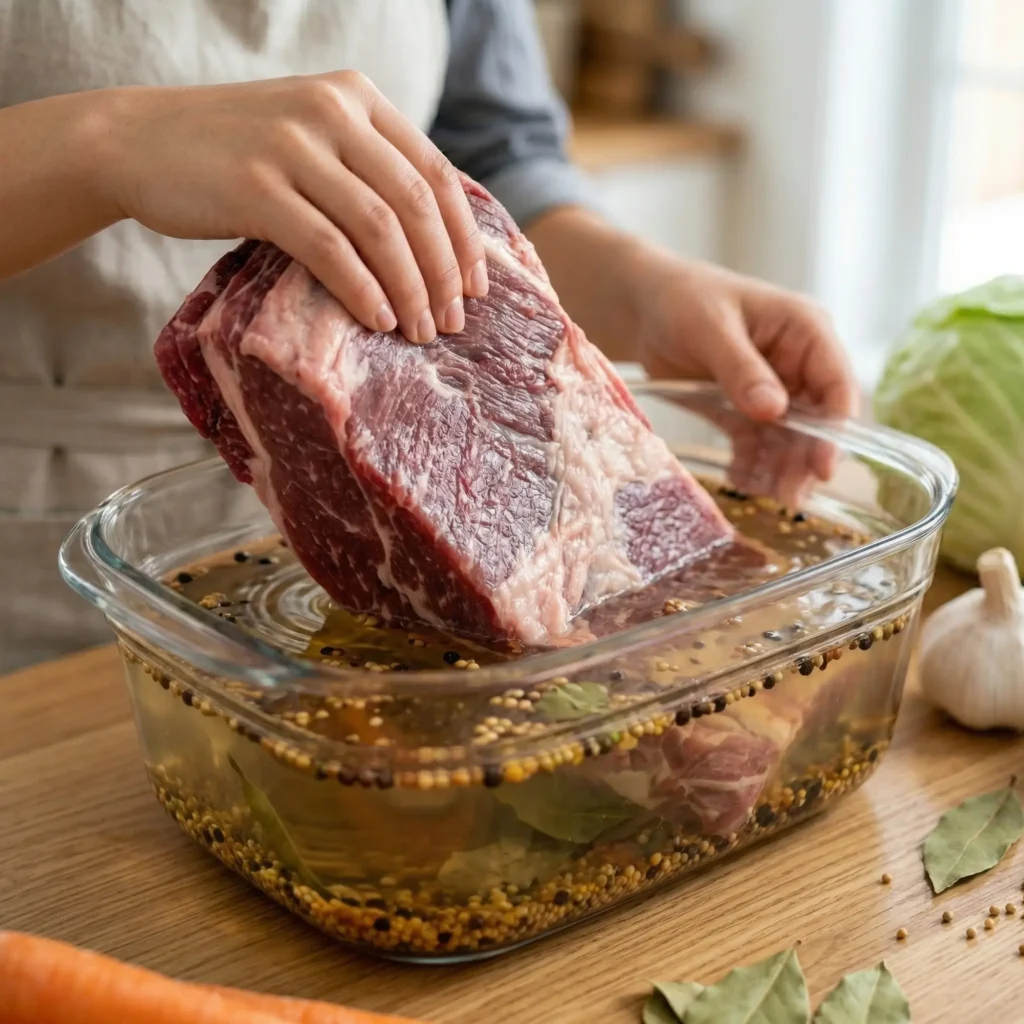Recipe Instructions: Prepare the brine by dissolving salt and sugar in warm water and letting it cool. Toast mustard seeds, coriander seeds, peppercorns, and bay leaves, then add to the brine. Submerge the brisket completely in the brine and refrigerate 5–7 days. Keep the meat fully submerged and maintain fridge temperature between 35–40°F (2–4°C). After curing, rinse the brisket under cold water to remove excess salt. Trim fat to about 1/4 inch thickness. Place brisket in a pot and cover with water and aromatics. Simmer gently for several hours until fork-tender. Add potatoes and carrots during the last hour of cooking. Add cabbage wedges during the last 20–30 minutes. Remove meat and let rest 15 minutes before slicing. Slice against the grain and serve with vegetables.