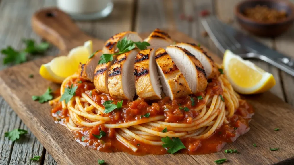 Cook 8 ounces of pasta until it’s al dente. Then, cook the marinated chicken in a skillet until it’s done. Put the pasta, chicken, and sauce together in a big dish. Mix well so the pasta and chicken are coated with the sauce.
