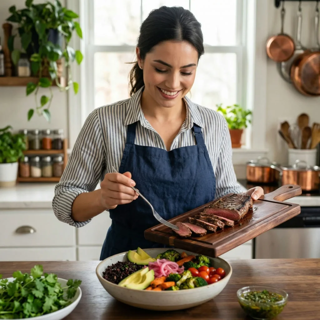 Recipe Instructions: Cook rice, quinoa, or cauliflower rice according to package instructions and set aside. Pat the steak dry and season with salt, pepper, garlic, soy sauce, olive oil, and lime juice. Heat a cast-iron or heavy skillet over medium-high heat until very hot. Sear the steak for 3–5 minutes per side until medium-rare or desired doneness. Remove steak from the pan and let it rest for 5–10 minutes. Slice steak thinly against the grain. Prepare vegetables by roasting, steaming, or slicing fresh. Assemble bowls with grains as the base. Add sliced steak, vegetables, avocado, and toppings. Drizzle with sauce (chimichurri, avocado crema, or soy-ginger glaze). Serve immediately and enjoy.